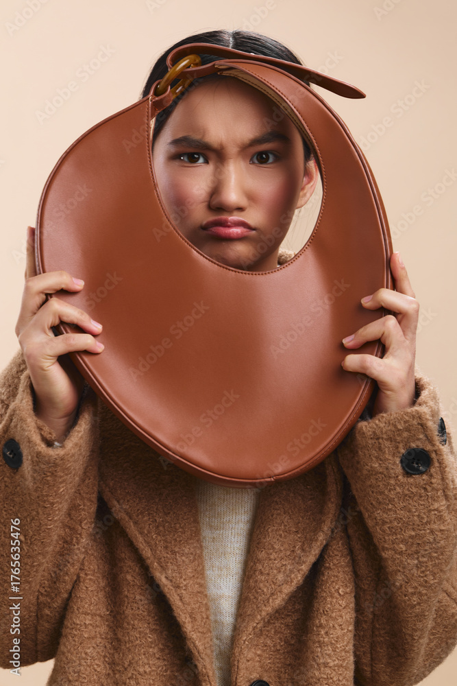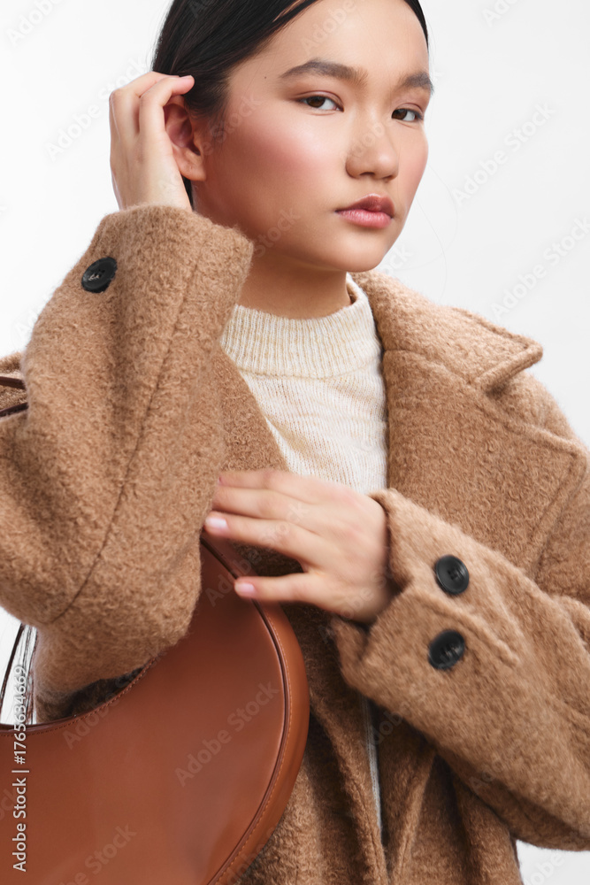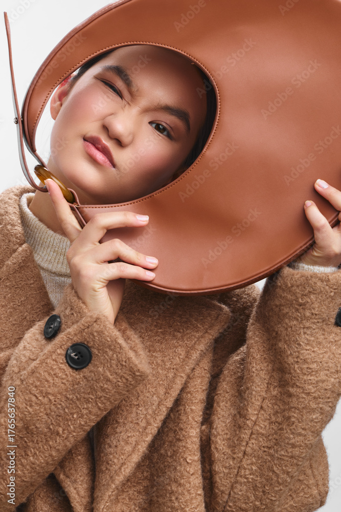 WEBLUX obraz na plátně 1D, 3D, 4D, 5D - Asian woman is posing with a round brown bag in a warm, stylish studio. She wears a cozy coat and gazes softly at the camera, conveying confidence and calm in a contemporary fashion mood.