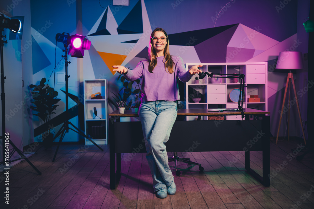 WEBLUX obraz na plátně 1D, 3D, 4D, 5D - Charming female content creator in vibrant workspace with modern equipment and colorful lighting