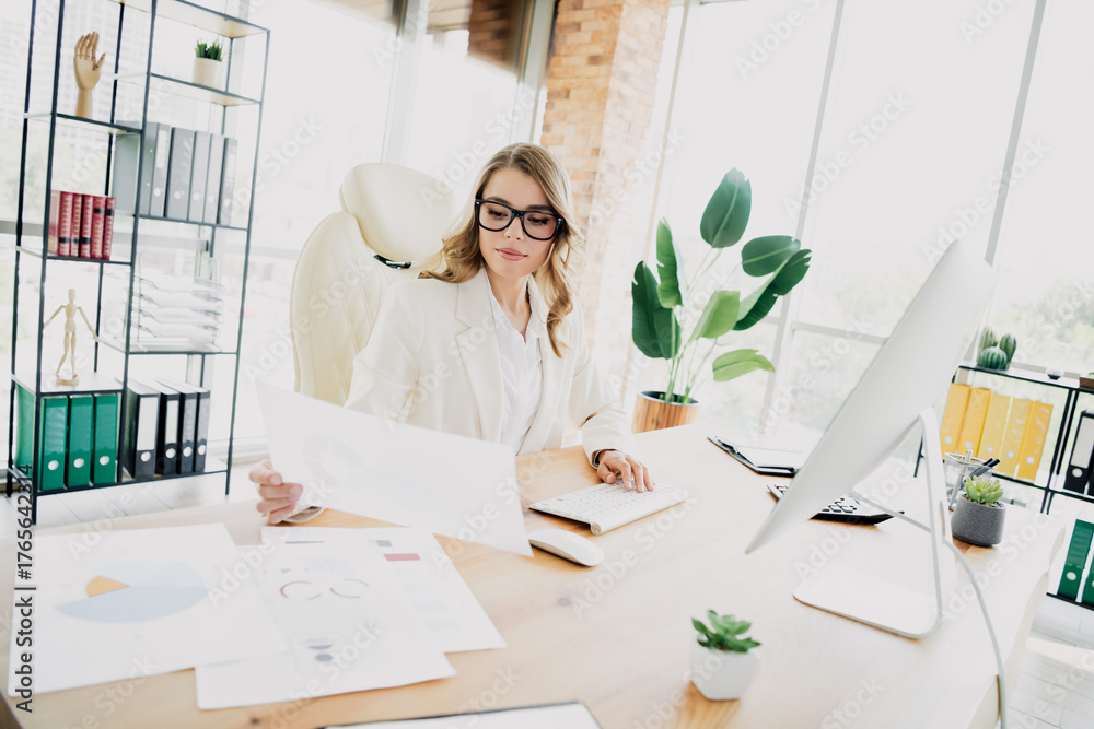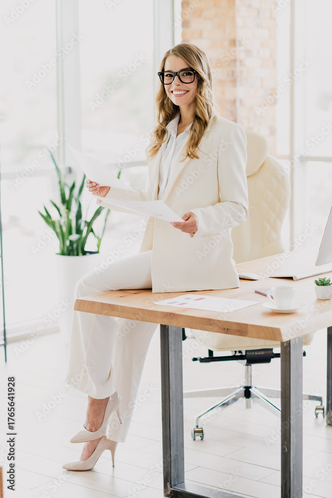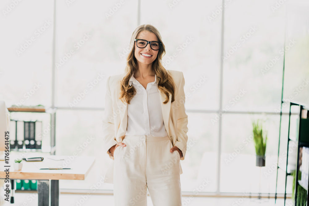 WEBLUX obraz na plátně 1D, 3D, 4D, 5D - Confident young businesswoman dressed in elegant white formalwear standing in a modern office with a bright interior