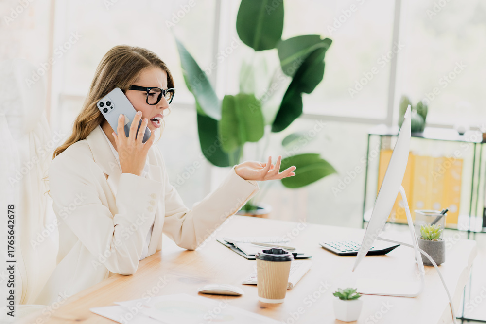 WEBLUX obraz na plátně 1D, 3D, 4D, 5D - Professional Businesswoman Talking on Smartphone While Working at a Modern Office Desk with Stylish Decor