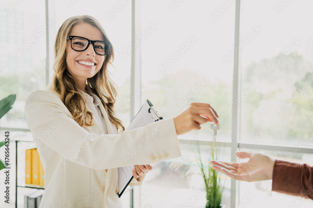 WEBLUX obraz na plátně 1D, 3D, 4D, 5D - Smiling businesswoman presenting keys in modern office interior showing professionalism and success in corporate environment