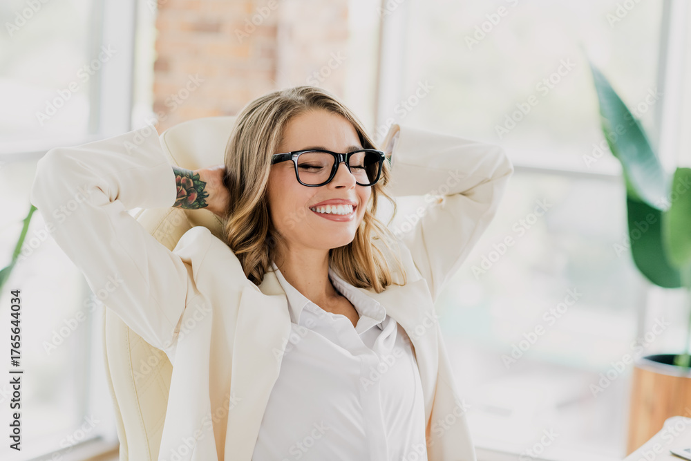 WEBLUX obraz na plátně 1D, 3D, 4D, 5D - Confident young businesswoman relaxing in an office, showcasing elegance and happiness while taking a break from work