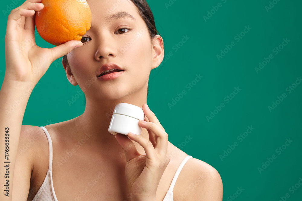 WEBLUX obraz na plátně 1D, 3D, 4D, 5D - asian woman holds an orange near her face and a small cream jar in hand, standing before a vivid green backdrop to illustrate a fresh skincare moment and confident glow.