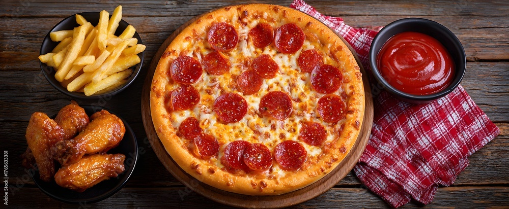 WEBLUX obraz na plátně 1D, 3D, 4D, 5D - The tempting pepperoni pizza sits with wings and crispy fries on a cozy table