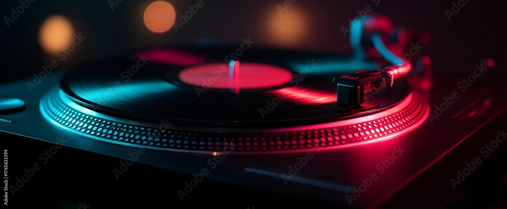 WEBLUX obraz na plátně 1D, 3D, 4D, 5D - The turntable vinyl record spins like a glowing comet under neon lights closeup.
