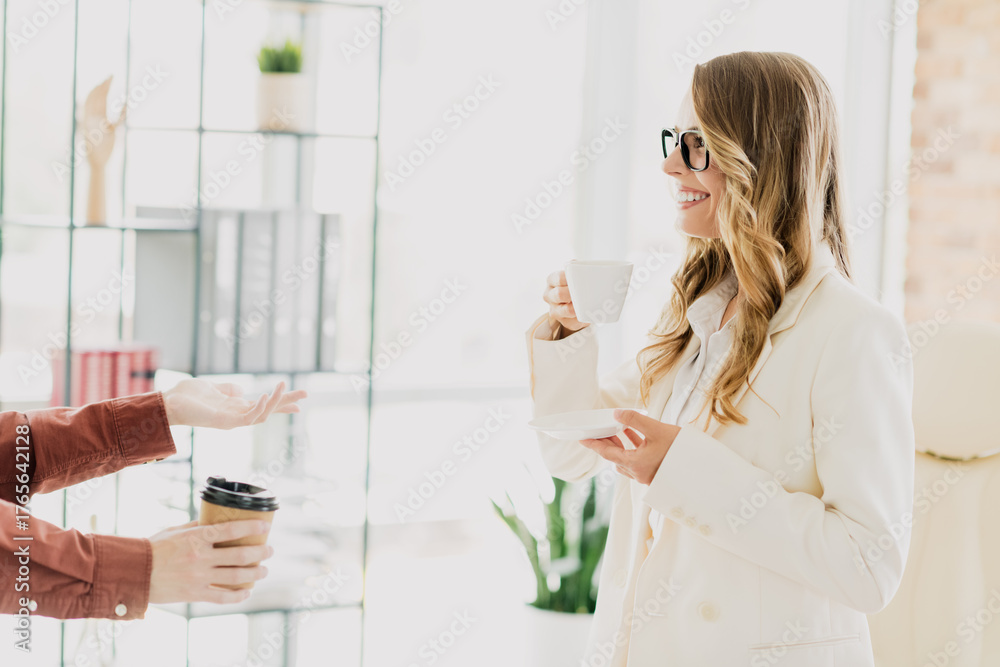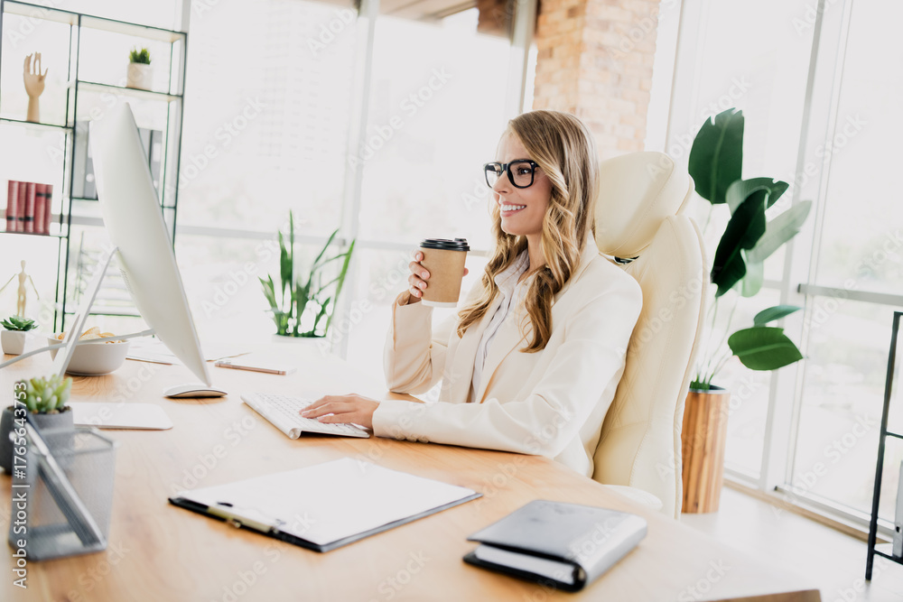WEBLUX obraz na plátně 1D, 3D, 4D, 5D - Blonde professional businesswoman enjoying coffee in modern office space with contemporary decor and natural lighting.
