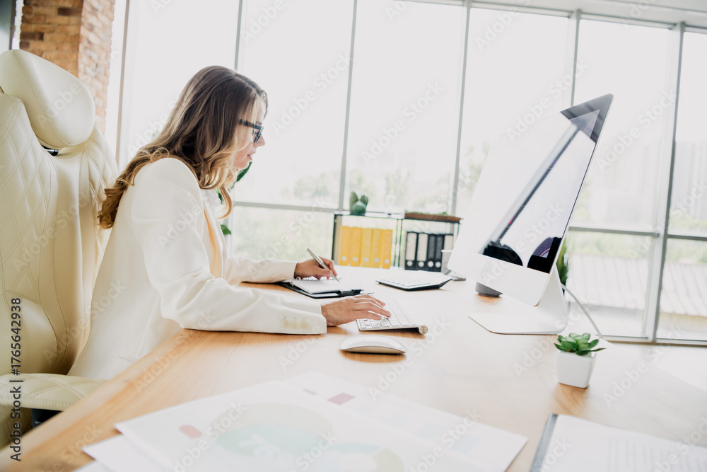 WEBLUX obraz na plátně 1D, 3D, 4D, 5D - Businesswoman Working in Modern Office with Desktop Computer in Elegant Attire